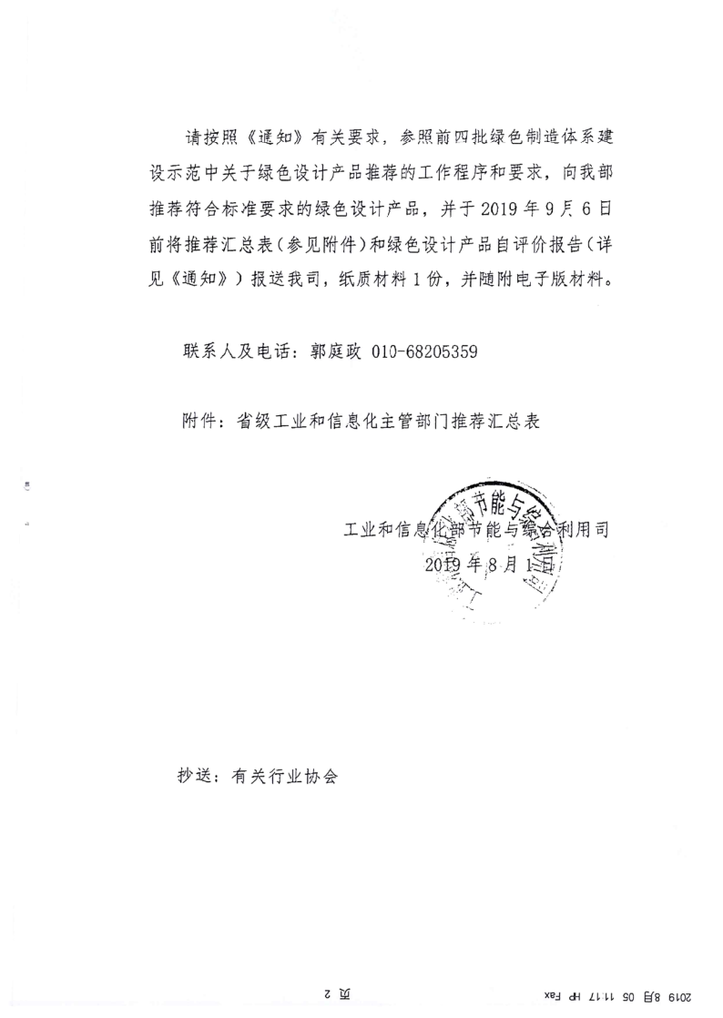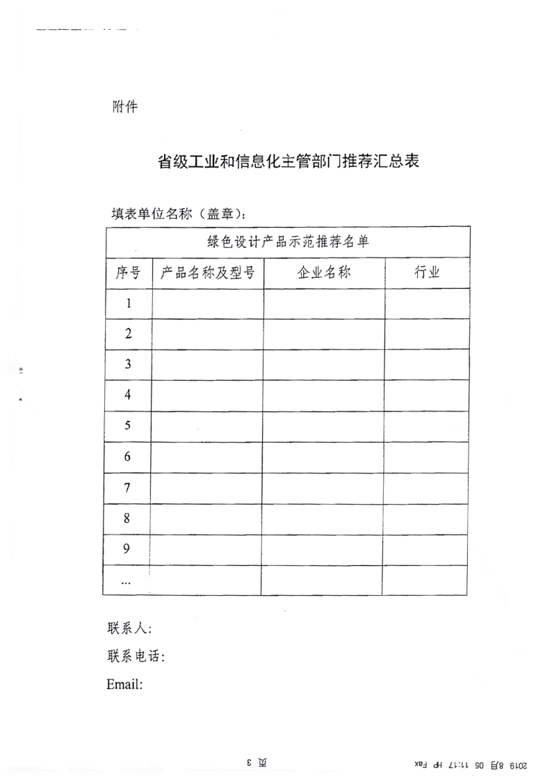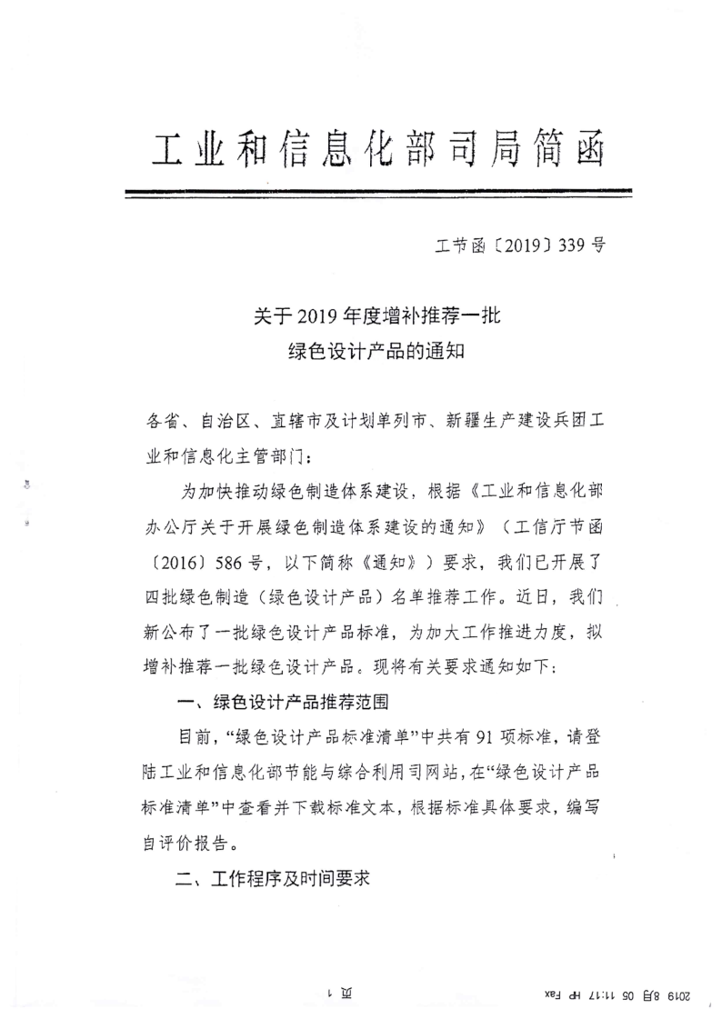 为加快推动绿色制造体系建设,现将工业和信息化部《关于2019年度增补推荐一批绿色设计产品的通知》转发你们。请各盟市按照通知要求,对照工信部最新公布的绿色设计产品标准(详见附件3),结合今年推荐第四批绿色设计产品示范的工作程序和要求,遴选推荐符合标准的产品,并于2019年8月25日前将申请材料(项目汇总表、绿色设计产品自评价报告)报送我厅,纸质材料一式三份,并随附电子版材料。
